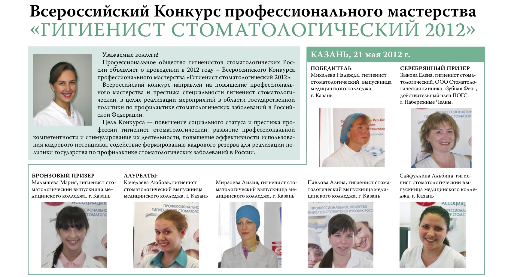Профессиональное общество гигиенистов стоматологических России и Стоматологическая Ассоциация Республики Татарстан 21 мая 2012 года в Казани провели региональный этап Всероссийского Конкурса профессионального мастерства «Лучший по профессии. Гигиенист стоматологический 2012» и Симпозиум "Федеральная программа профилактики стоматологических заболеваний. Роль гигиениста стоматологического".