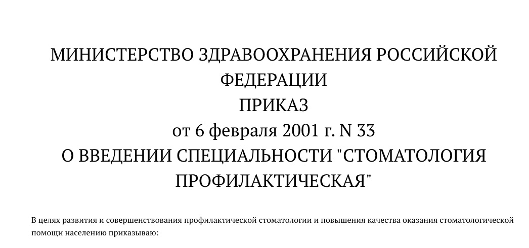 Работа команды специалистов под руководством академика Валерия Константиновича Леонтьева, при участии профессора Кузьминой Эдит Минасовны и доктора медицинских наук Шевченко Олеся Вячеславовича в 2001 году увенчалась успехом. 06 февраля 2001 года был утвержден Приказ Минздрава России №33 "О введении специальности "Стоматология профилактическая". В России, как и в 38 странах мира появились гигиенисты стоматологические и система оказания стоматологической помощи начала выстраиваться на основе первичной профилактики стоматологических заболеваний!
